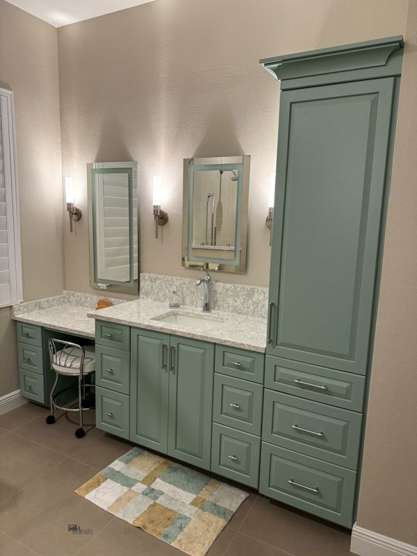 - Specialized Storage - Custom solutions for toiletries, towels, and appliances that keep your bathroom organized and clutter-free. Our bathroom cabinets include features like hair tool organizers, hidden laundry hampers, and adjustable shelving.